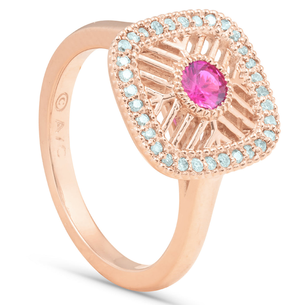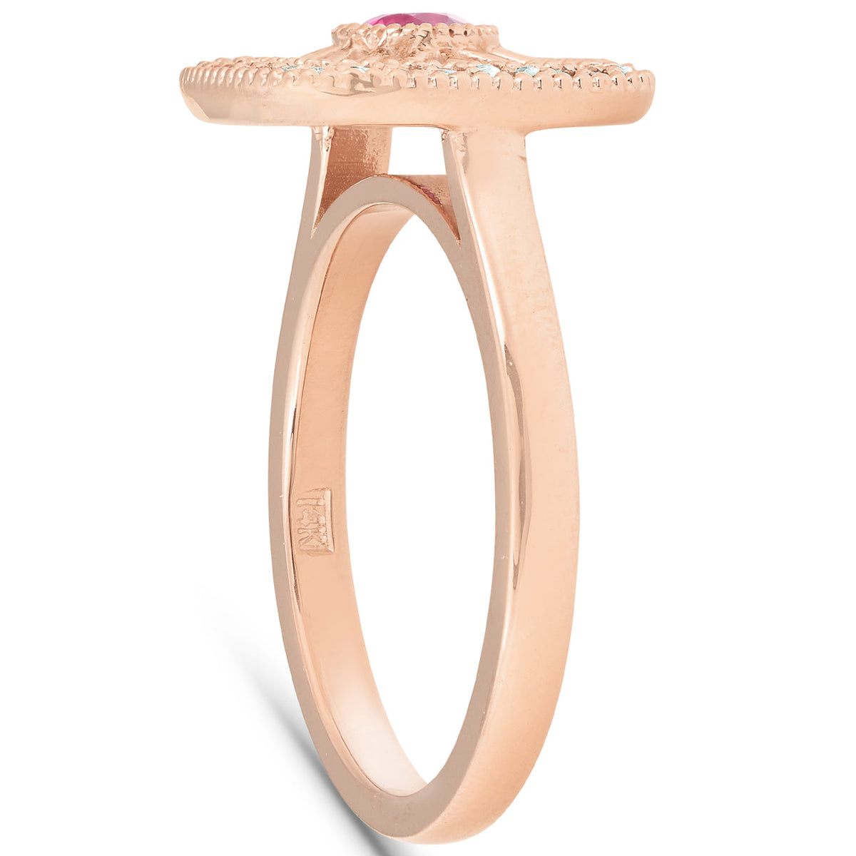 1/2 Ct Diamond & Ruby Fashion Designer Ring 14k Rose Gold by Pompeii3 Rings features a genuine round cut ruby at the center, surrounded by 32 round cut diamonds. The diamonds are prong set in solid 14k rose gold, creating a unique and fashionable accent perfect for adding a touch of elegance to any wardrobe.