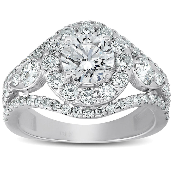 2 ct Halo Diamond Multi Row Engagement Ring 14k White Gold by Pompeii3 Rings features a 1/2ct round brilliant cut genuine clarity-enhanced diamond at the center, flanked by round cut accent diamonds in a multi-row halo setting. This ring offers a sparkling and dramatic look.