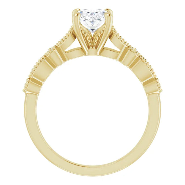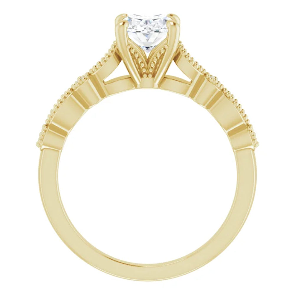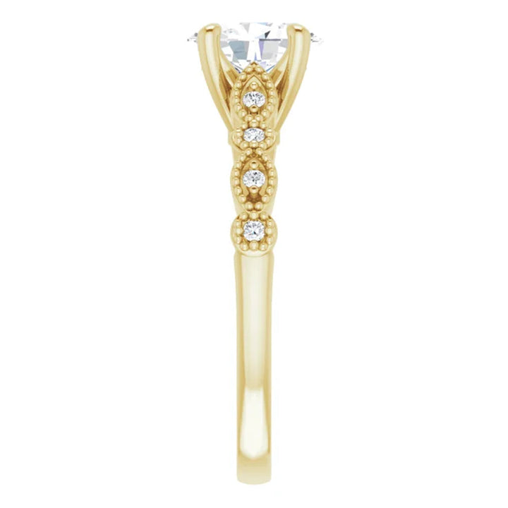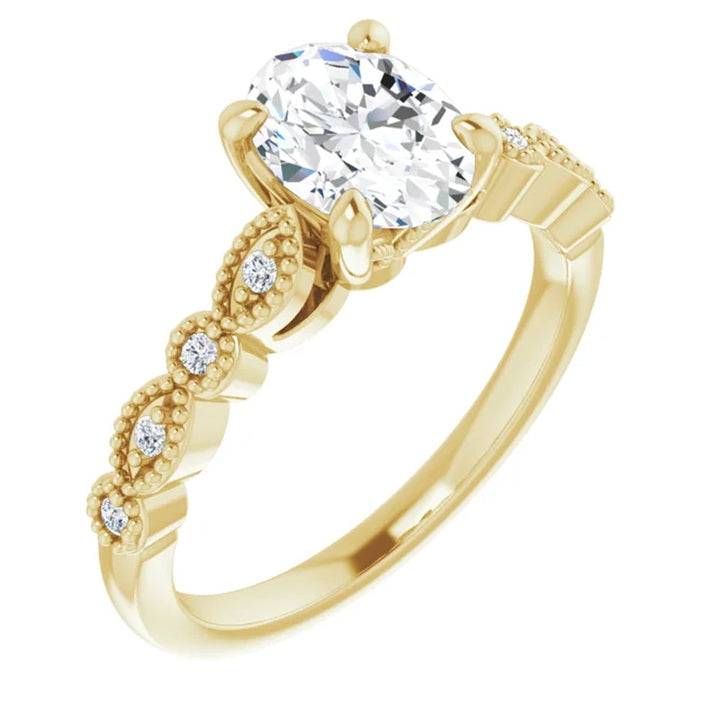 1 1/10 Ct Moissanite & Lab Grown Diamond Engagement Ring 10k Yellow Gold by Pompeii3 Rings features a 1ct oval moissanite and eight round cut lab-grown diamonds, set in solid 10k yellow gold. The mix of shapes and diamond types offers brilliance and contrast, perfect for a timeless engagement ring.