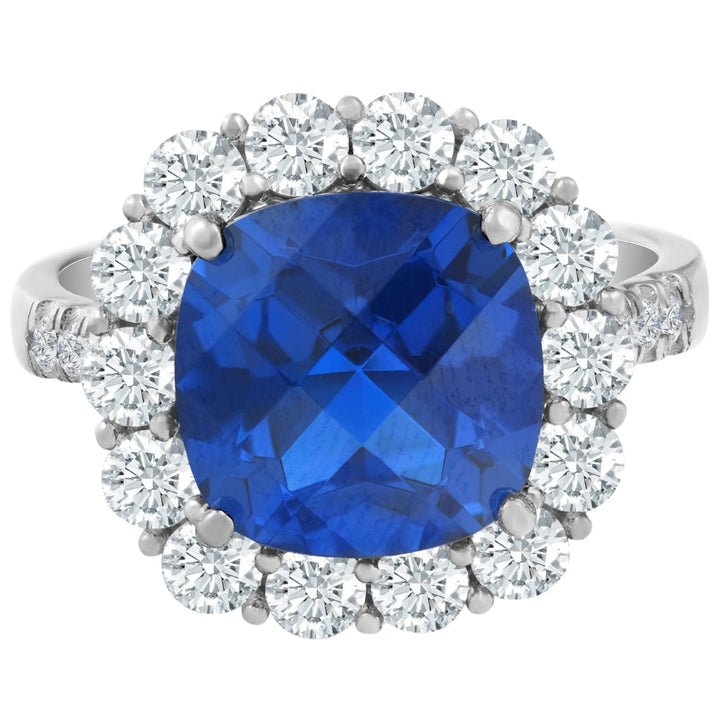 6 1/2 Ct Diamond Halo Created Sapphire Ring 10k White Gold by Pompeii3 Rings showcases a stunning 10mm created blue cushion sapphire, surrounded by round cut accent diamonds. All diamonds are prong set in solid 10k white gold, creating an elegant, eye-catching design.