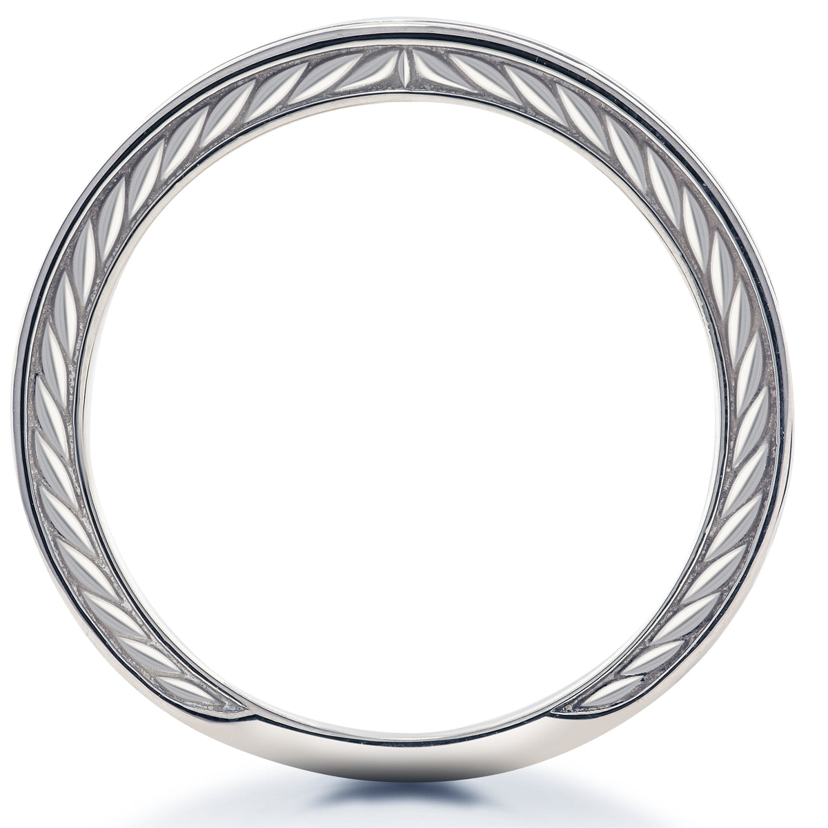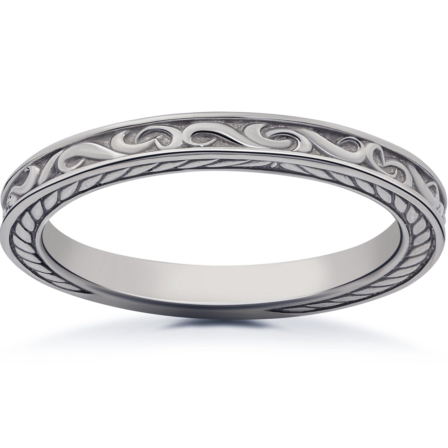 Available in solid white, yellow, rose gold, or platinum, featuring a hand-carved vintage scroll design.