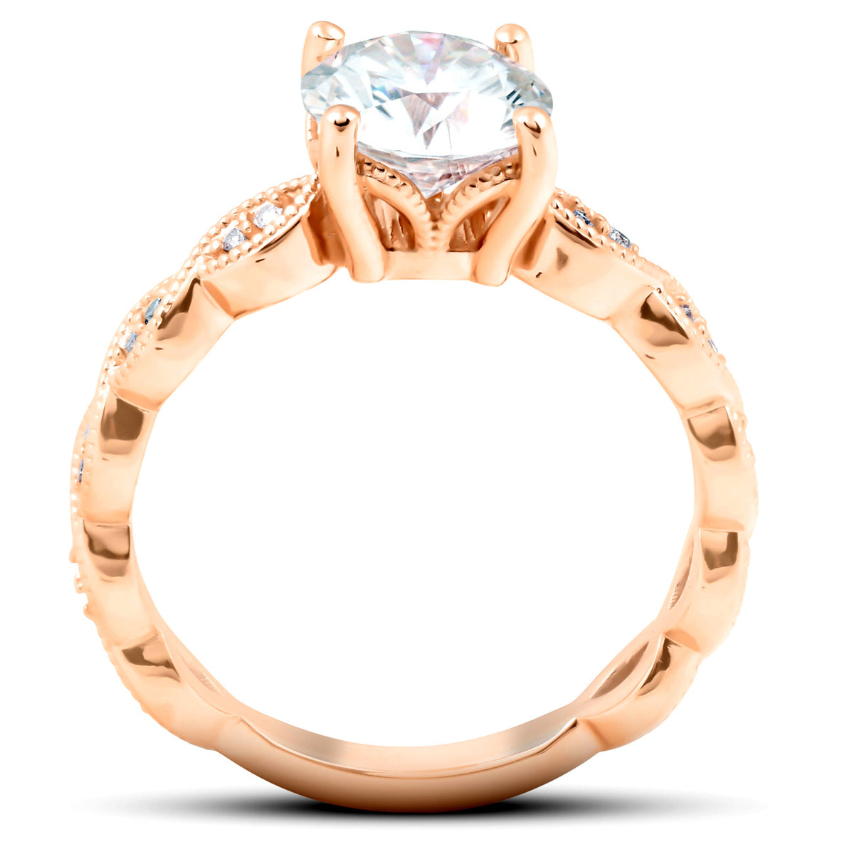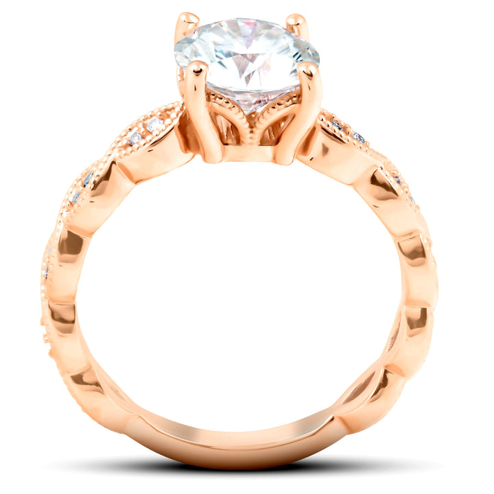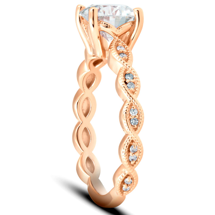 2 1/10Ct Diamond & Moissanite Vintage Engagement Ring 14k Rose Gold by Pompeii3 Rings features a stunning 8mm genuine moissanite center stone, flanked by 20 round cut diamonds. The stones are prong set in a solid 14k rose gold setting with a marquise-shaped pattern going down either side of the center stone. This vintage-inspired design combines the brilliance of moissanite with the timeless elegance of diamonds.