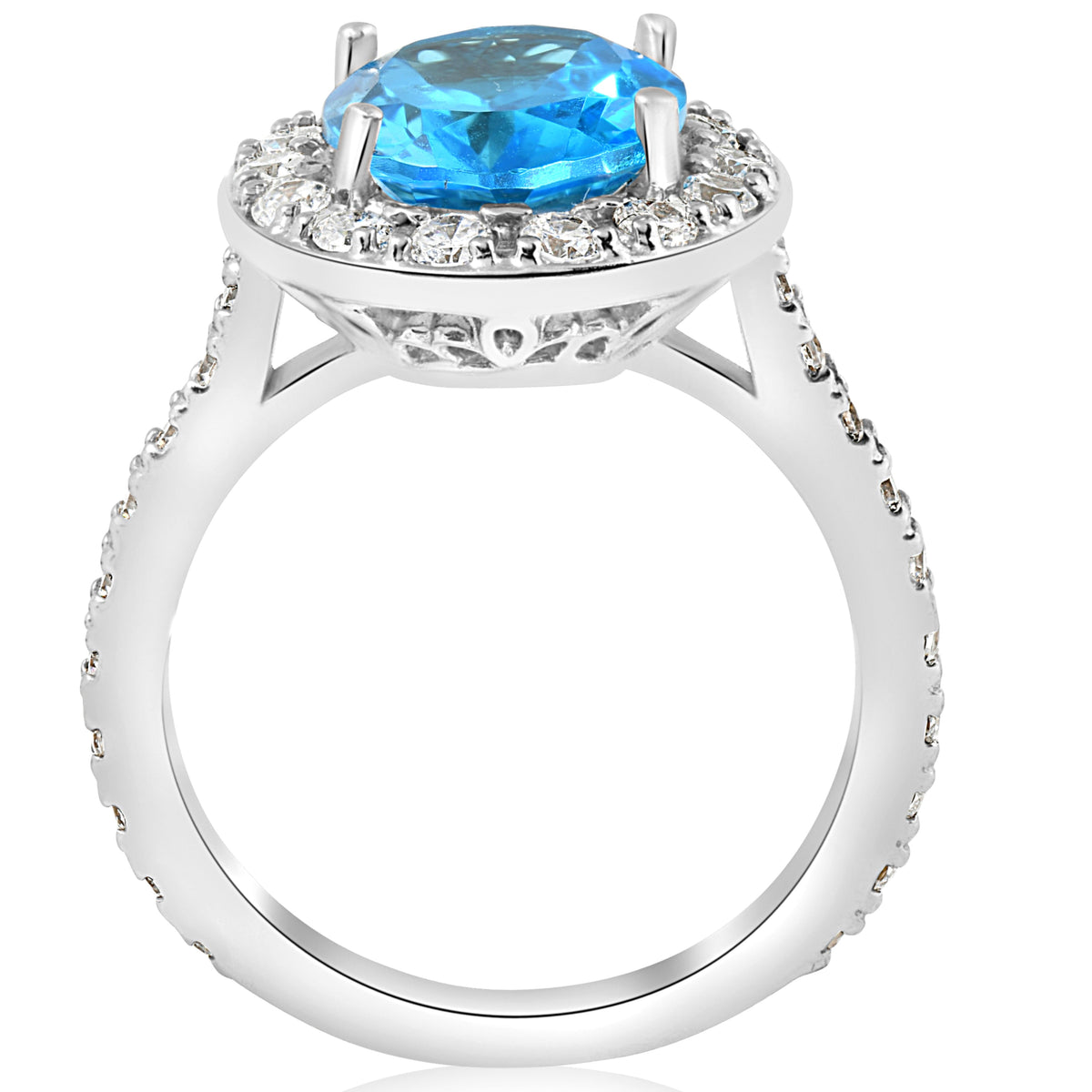 4 cttw Blue Topaz Diamond Halo Vintage Ring Engagement 14k White Gold by Pompeii3 Rings features a stunning 10x8mm blue oval topaz, surrounded by 34 round cut diamonds, creating a striking contrast between the deep blue topaz and sparkling diamonds. The vintage-inspired setting in 14k white gold is perfect for engagements or special gifts.