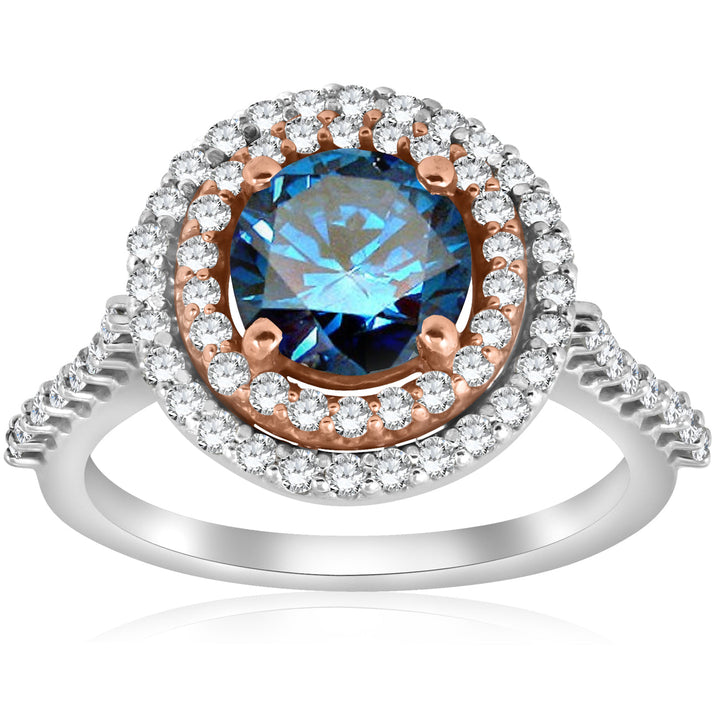 2.10ct Double Halo Blue Diamond 14k Rose & White Gold Halo Engagement Ring by Pompeii3 Rings features a 1 1/2ct round blue color enhanced diamond at the center, surrounded by a double halo of 64 round brilliant cut diamonds. The combination of 14k rose and white gold adds a unique touch to this stunning piece.