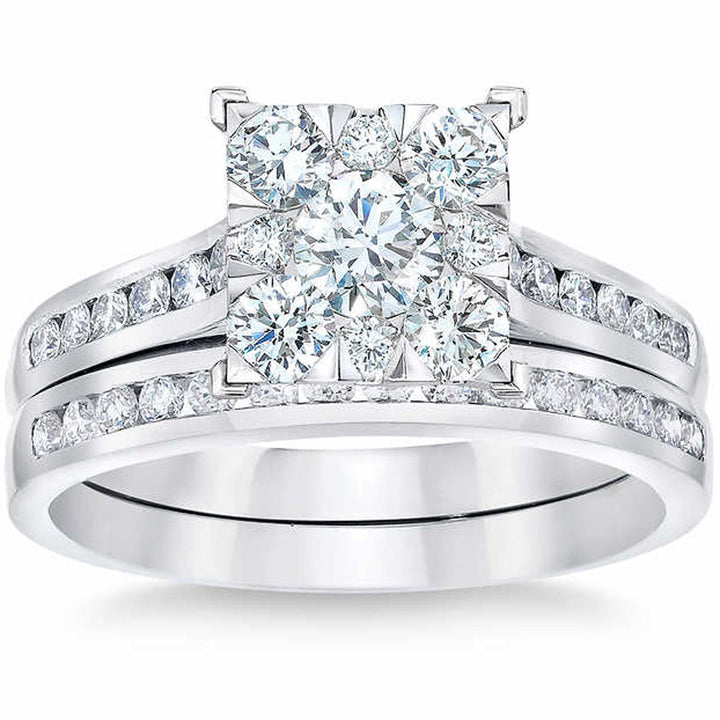 2 Ct Diamond Princess Cut Framed Engagement Wedding Ring Set White Gold by Pompeii3 Rings features a 2 ct total weight with 36 round cut diamonds. The side stones are channel set, and the main top is prong set, offering a bold, eye-catching design with a perfect balance of elegance. The matching wedding ring completes this stunning set.