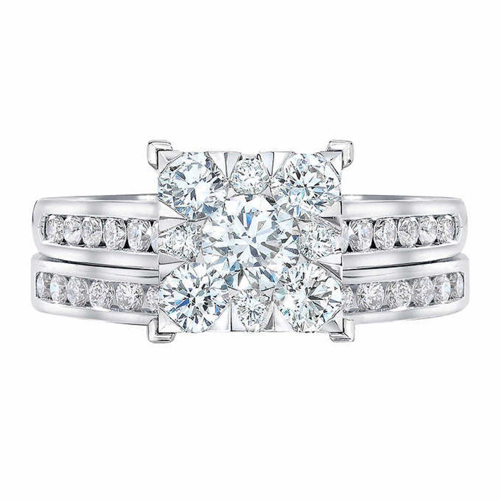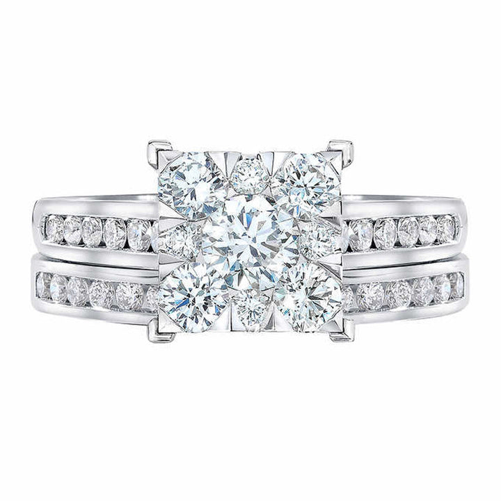 Made from solid white gold, featuring 2 ct total weight of diamonds with 36 round cut diamonds channel set and prong bead set. Matching wedding band included.