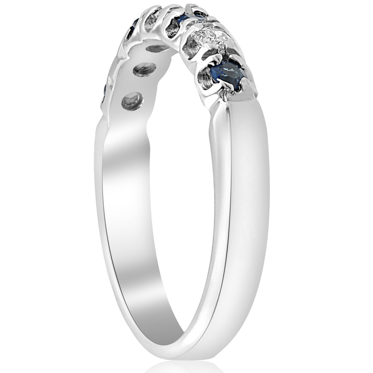 1/3ct Blue Sapphire & Diamond Wedding Ring Stackable Band White Gold 10k by Pompeii3 Rings features round genuine sapphires alternating with diamonds. Perfect for stacking with other rings or complementing an engagement ring, this stylish band is crafted in solid 10k white gold for a sleek, modern look.