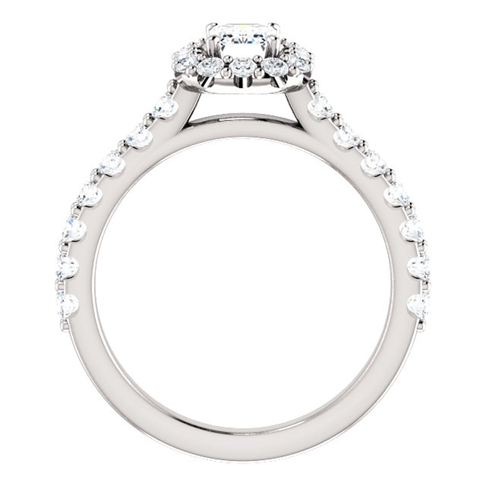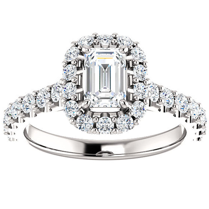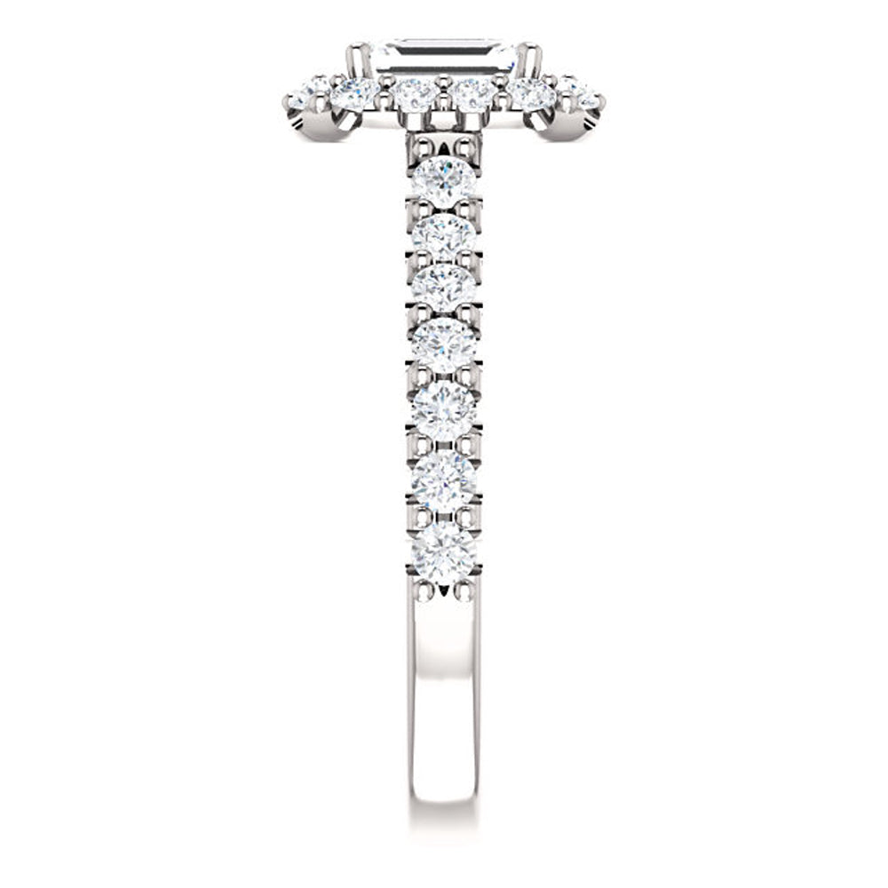 1 3/4 Ct Emerald Diamond Halo Engagement Ring 14k White Gold by Pompeii3 Rings features a 1 ct emerald cut genuine lab-grown diamond at the center, surrounded by 28 round cut diamonds in a raised halo design. This ring is designed to allow a wedding or matching band to lay flush against it, making it an ideal choice for a seamless wedding set.