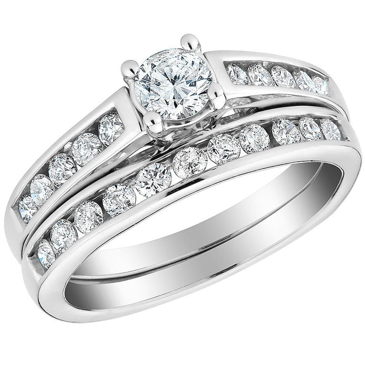Made from solid 10k white gold, featuring 22 round brilliant cut diamonds channel set in the engagement ring and prong set in the matching wedding band.