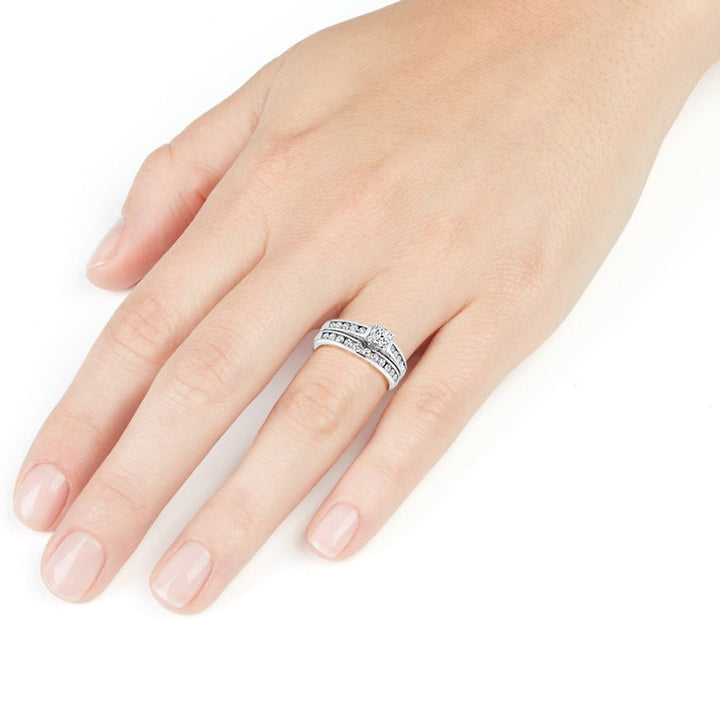1/2 Ct Diamond Engagement Wedding Ring Set 10k White Gold by Pompeii3 Rings features 22 round brilliant cut diamonds channel set in a solid white gold mounting. The matching wedding ring complements the engagement ring, creating a seamless and elegant wedding set.