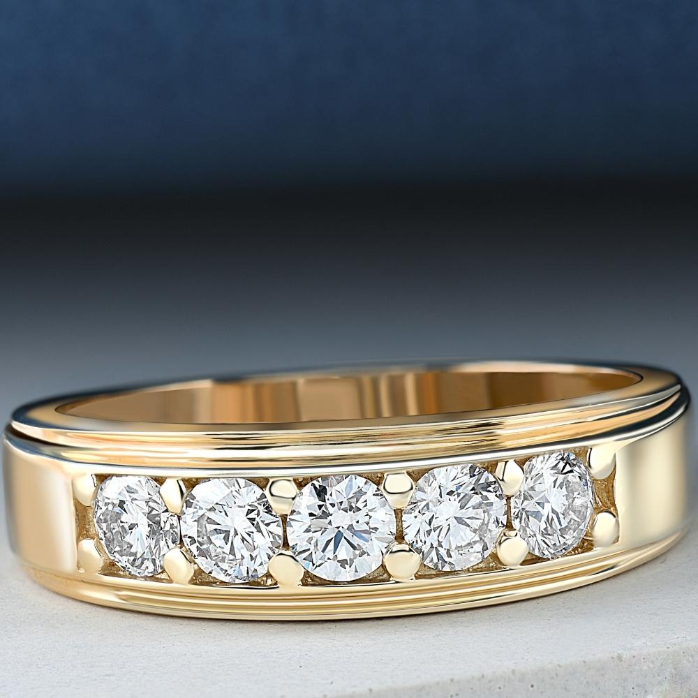 1 Ct Diamond Ring Men's High Polished 14k Yellow Gold Wedding Anniversary Band by Pompeii3 Rings features five round brilliant cut diamonds prong set in solid 14k yellow gold. The heavy-weight, high-polished band offers a classic and stylish look, perfect for a men's wedding or anniversary band.