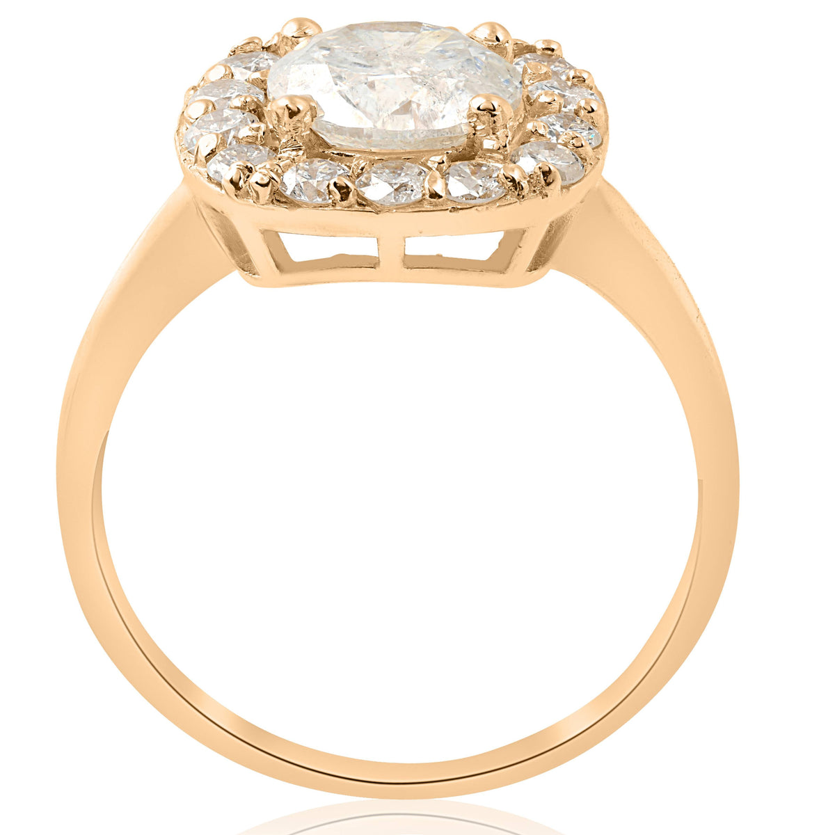 Made from solid 14k yellow gold, featuring a 1 1/2ct round brilliant cut clarity-enhanced diamond surrounded by 14 round cut diamonds.