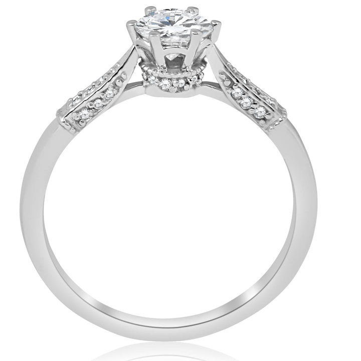 5/8ct Diamond Engagement Ring Vintage 14k White Gold Round Cut by Pompeii3 Rings features a 1/2 ct round diamond clarity-enhanced center stone and 26 round cut natural diamonds. All diamonds are set in solid 14k white gold, creating a vintage-inspired engagement ring.