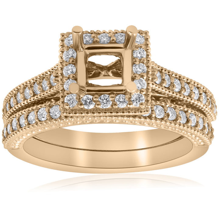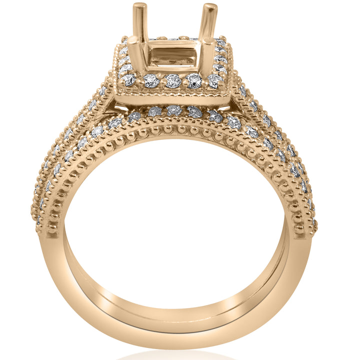 This Yellow Gold Princess Cut Diamond Halo Engagement Ring Semi-Mount by Pompeii3 is a stunning and elegant choice. Featuring 53 round-cut diamonds, this ring is set in solid 14K yellow gold. The setting is designed to fit a 5mm square princess-cut stone, with a matching wedding band included for a complete bridal set.