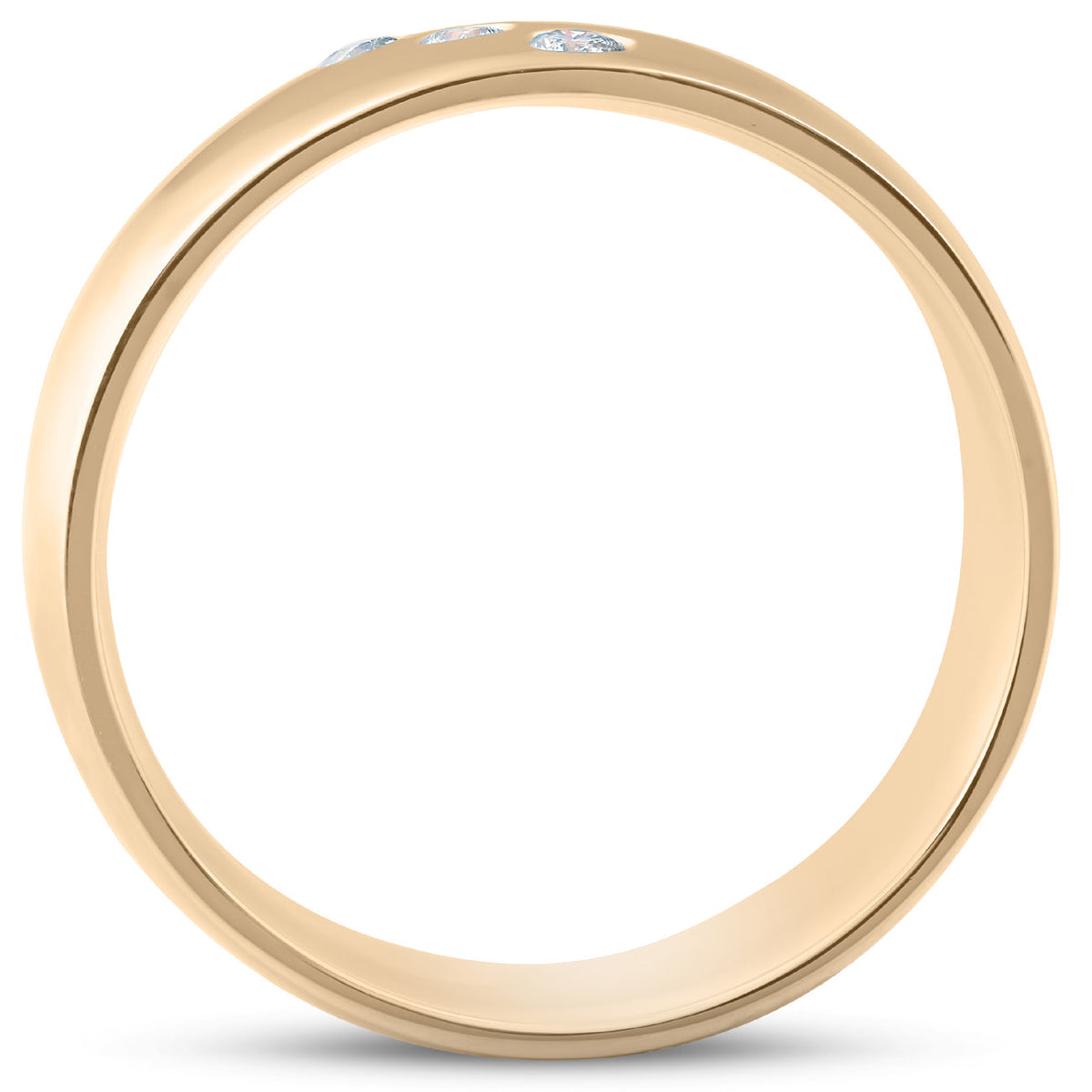 Crafted in 10K yellow gold, featuring three round brilliant-cut genuine diamonds in a channel setting. 7mm band width.