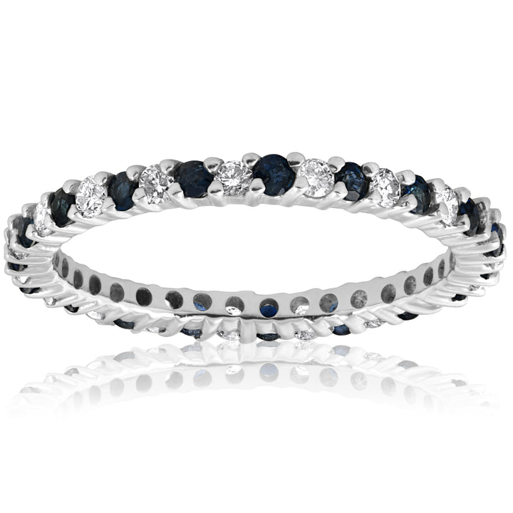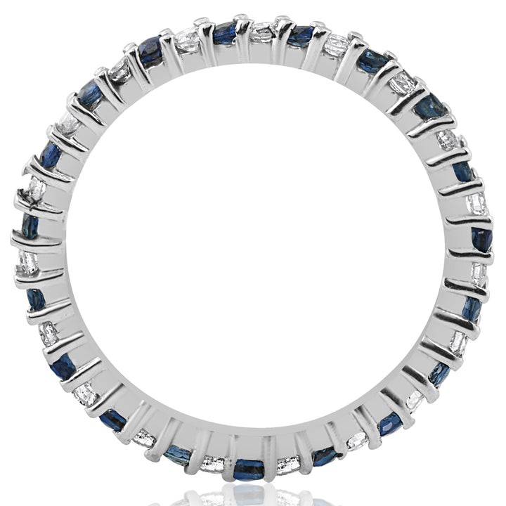 Crafted in 14K white gold, featuring alternating blue sapphires and white diamonds in a prong-set eternity design.