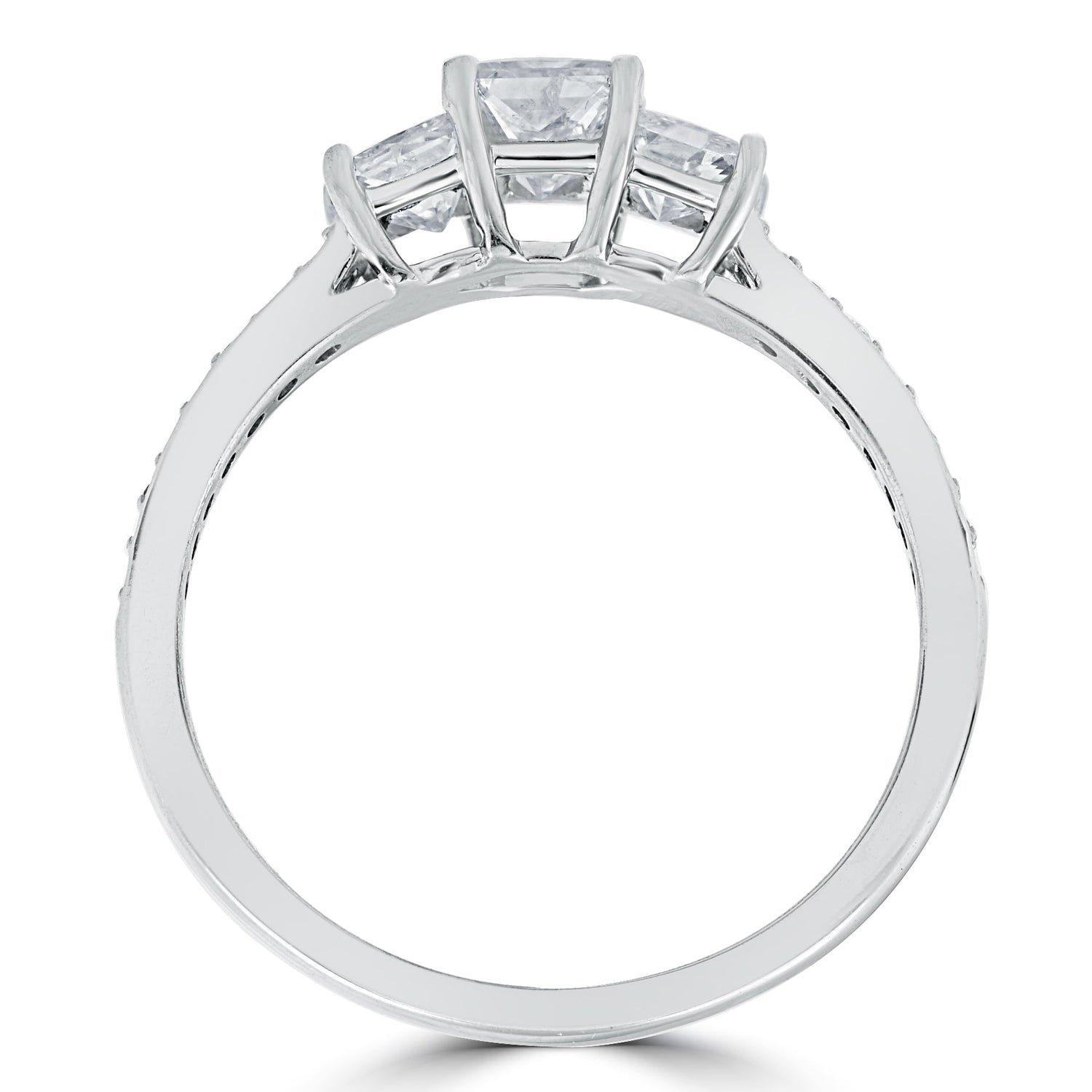 Crafted in 14K white gold, featuring three princess-cut diamonds and 16 round-cut diamonds in a prong setting.