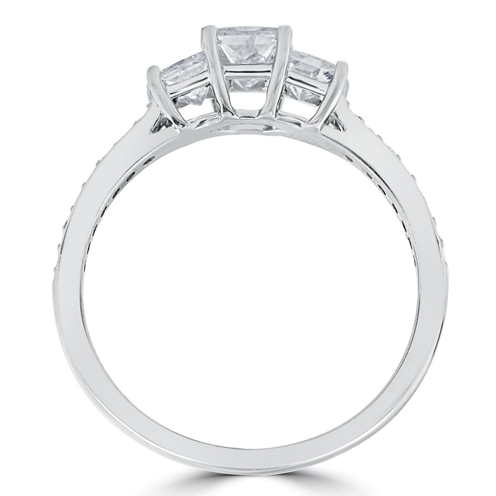 This 3/4 Cttw Princess Cut 3-Stone Diamond Engagement Ring by Pompeii3 is a striking and sophisticated design. Featuring three princess-cut diamonds and 16 round-cut diamonds, this engagement ring is set in solid 14K white gold. The combination of square and round diamonds creates a balanced and timeless look.