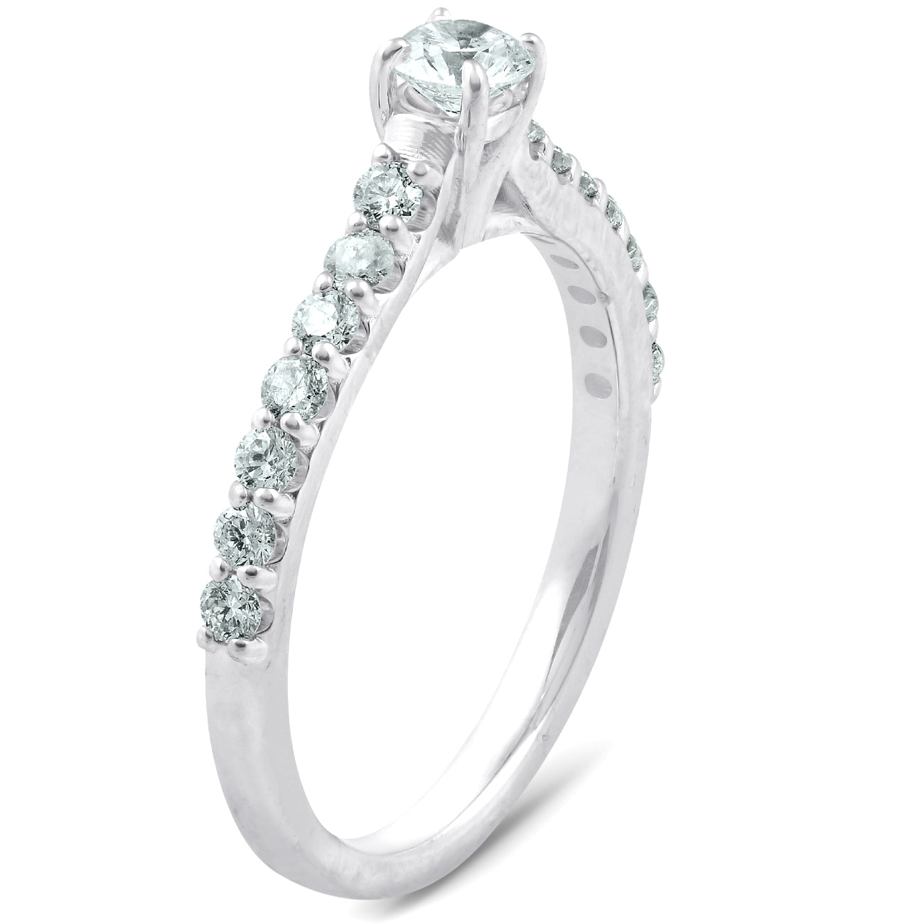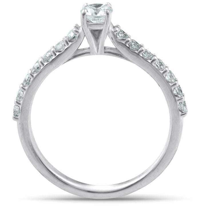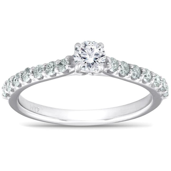 This 3/4 Ct TDW Diamond Side Stone Engagement Ring by Pompeii3 is a classic and elegant design. The ring features a 1/4 ct round brilliant-cut genuine center diamond, flanked by 14 round-cut accent diamonds along the sides for added brilliance. Set in polished 14K white gold, this timeless engagement ring exudes sophistication and sparkle.