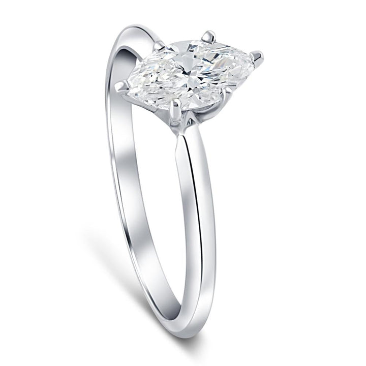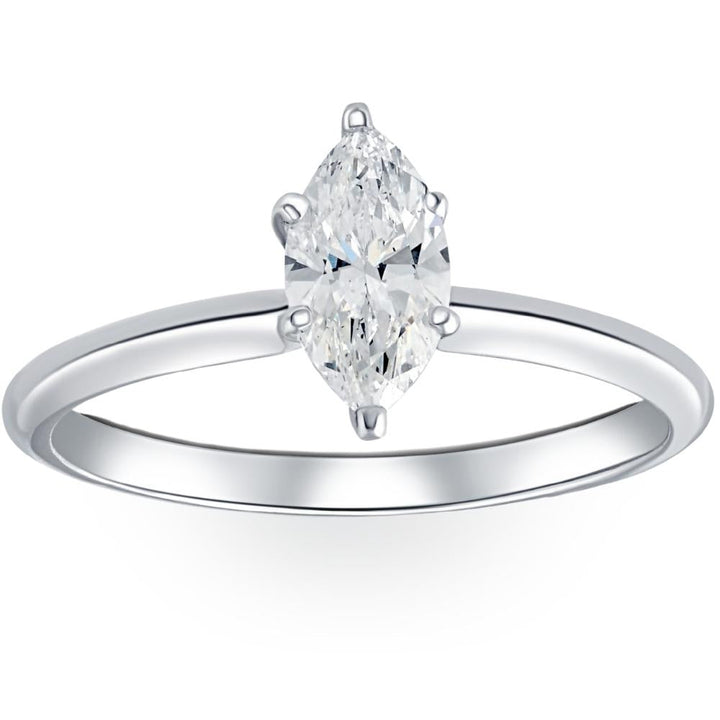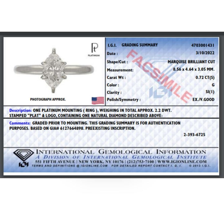Crafted in solid platinum, featuring a 0.72 ct marquise-cut natural diamond (G color, SI1 clarity) in a prong setting. Finger size: 7. IGI certificate included.