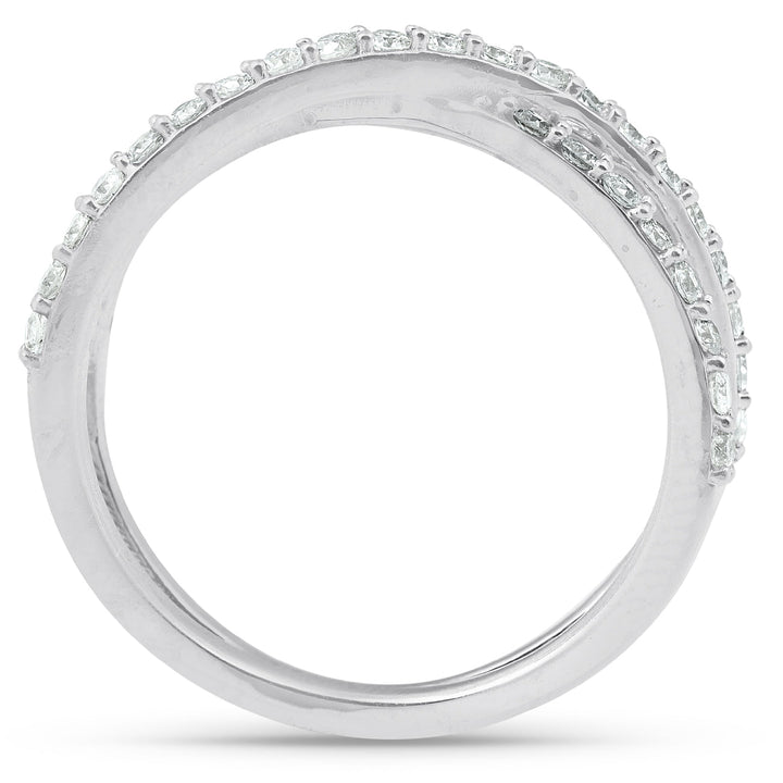 This 1/2 Ct Diamond X Ring by Pompeii3 is a bold and stylish statement piece. Designed with an intricate multi-row crossover "X" pattern, this wide fashion ring sparkles with 37 round brilliant-cut diamonds. The solid 10K white gold high-polished setting enhances the modern and eye-catching aesthetic, making it an ideal cocktail or evening ring.