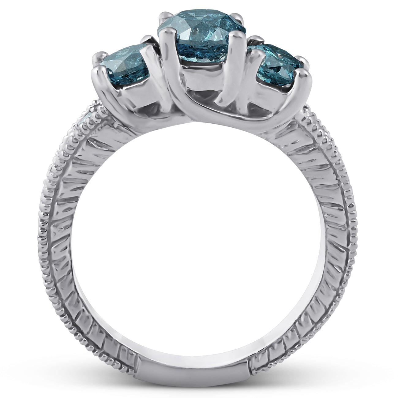 1 1/2 Ct Three Stone Vintage Blue Diamond Engagement Ring 14k White Gold Antique