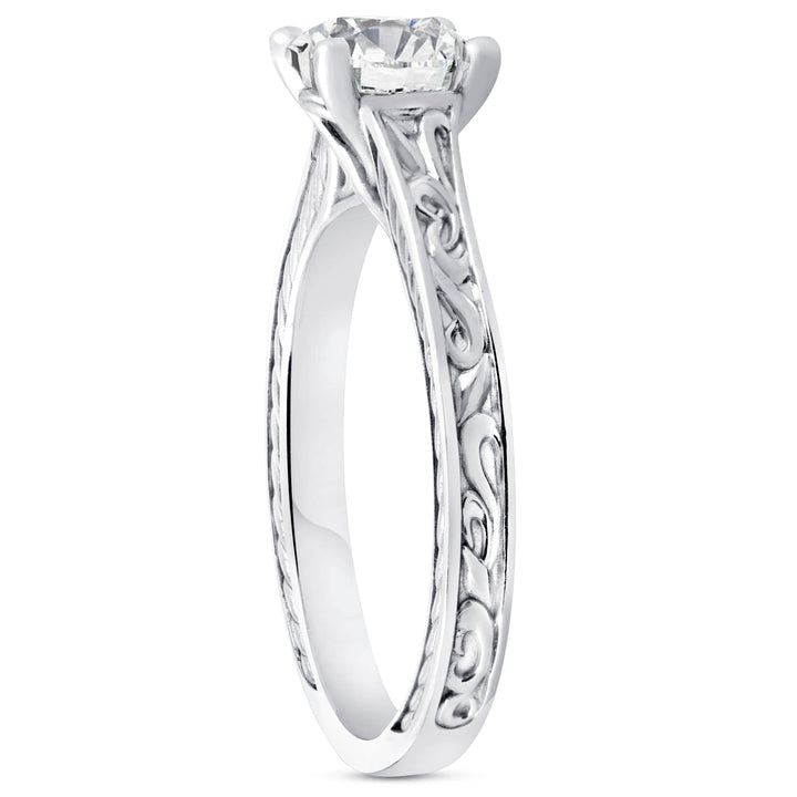 This 1 Ct Solitaire Round Cut Vintage Diamond Engagement Ring by Pompeii3 is a stunning blend of old-world charm and modern brilliance. The 1 ct round brilliant-cut lab-grown diamond is set in a high-polished 14K white gold vintage-inspired mounting. Delicate hand-engraved patterns on the band’s walls add an antique touch, making this ring a timeless and romantic choice.