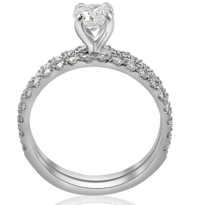 Crafted in 14K white gold, featuring a 1/3 ct round brilliant-cut center diamond and 38 round brilliant-cut diamonds in a French pave setting. Includes a matching diamond wedding band.