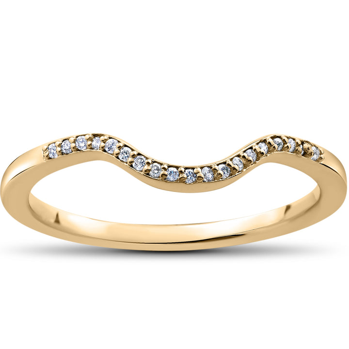 This 1/16 Ct Lab-Created Diamond Aria Wedding Curved Contour Ring by Pompeii3 is a refined and elegant wedding band. Designed with a slight curve to sit flush against an engagement ring, this band features 18 round-cut EX3 lab-grown diamonds for a subtle yet radiant sparkle. The high-polished setting enhances its brilliance, making it an ideal addition to a bridal set.