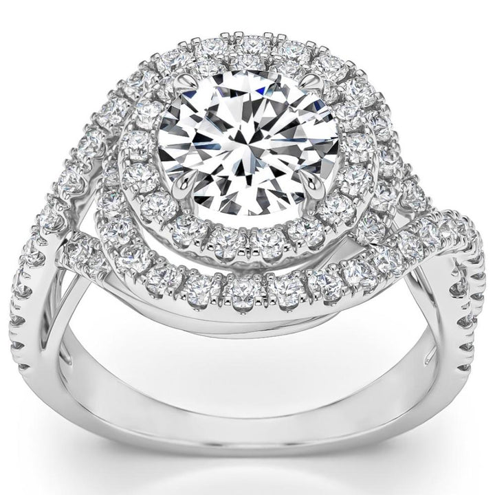 This 2.65 Ct Halo Lab-Grown Diamond Engagement Ring by Pompeii3 is a true showstopper. At its center, a striking 1 3/4 ct round brilliant-cut lab-grown diamond is surrounded by a shimmering halo of 82 round brilliant-cut lab-grown accent diamonds. Set in polished 10K white gold, this ring offers an exquisite blend of elegance and brilliance.