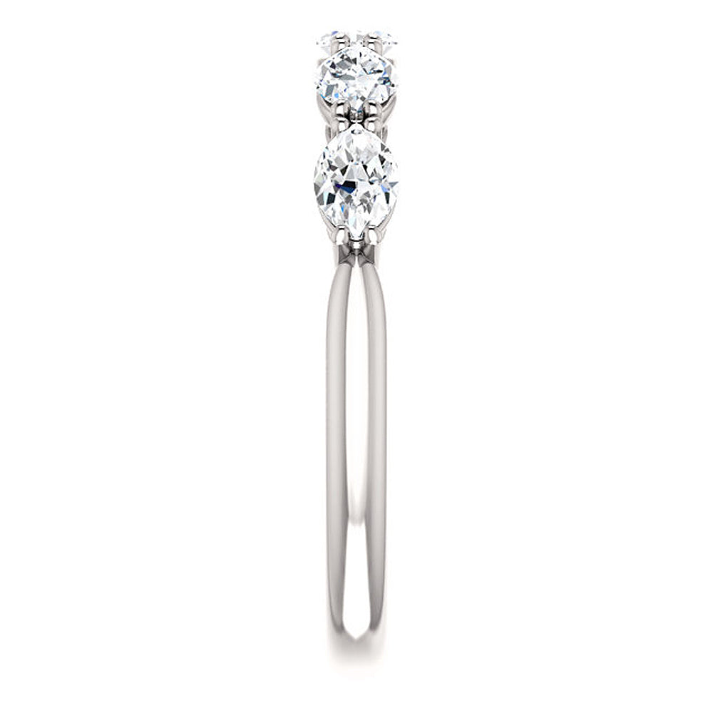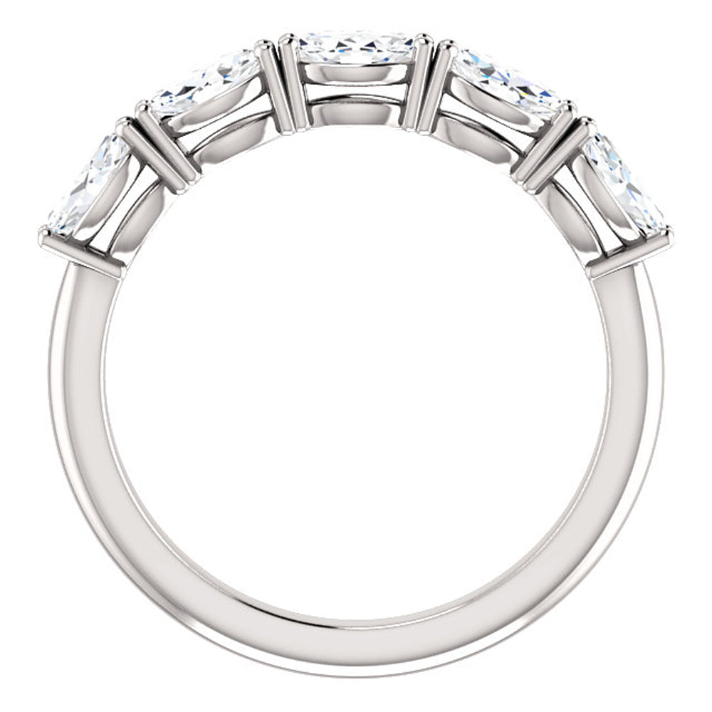 Crafted in solid gold (available in white, yellow, or rose gold), featuring five 5x3mm oval brilliant-cut moissanite stones in a half-eternity design.