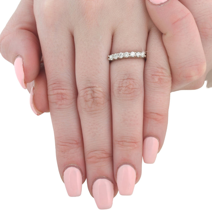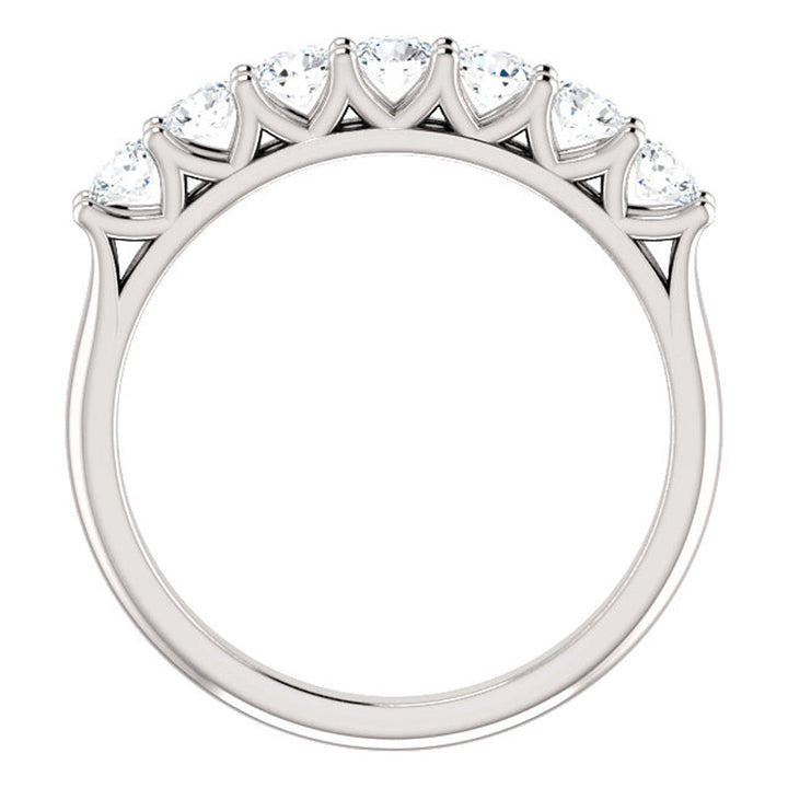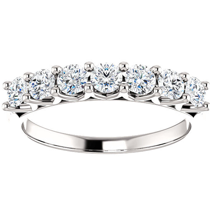 This 1/2 Ct Seven Stone Diamond Wedding Ring Lab Grown by Pompeii3 features seven round cut lab-grown diamonds, prong set in solid 14K white gold. This piece is ideal for stacking with other bands or complementing an engagement ring, offering both versatility and elegance. The seven diamonds symbolize completeness, making this a perfect choice for a wedding ring or anniversary gift.