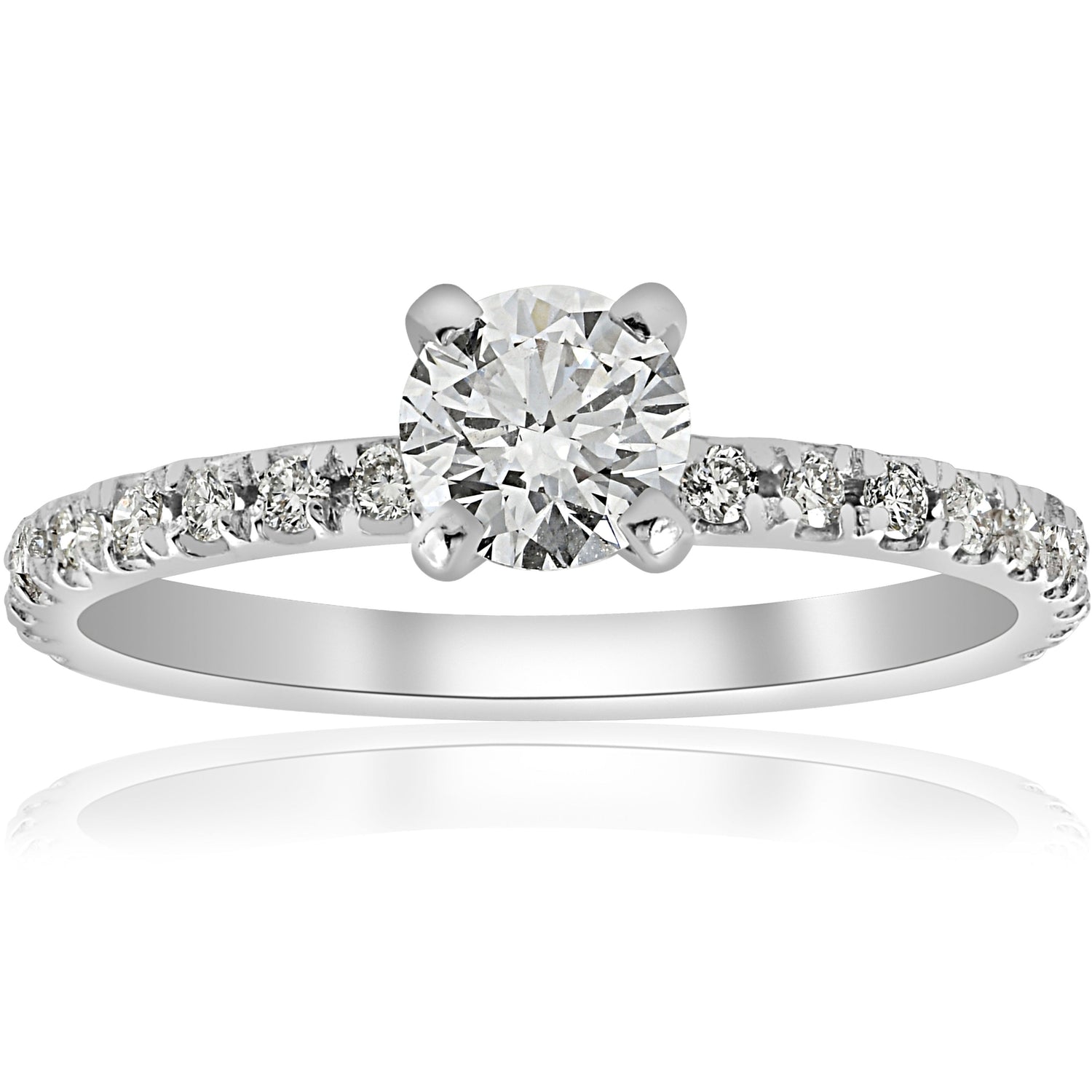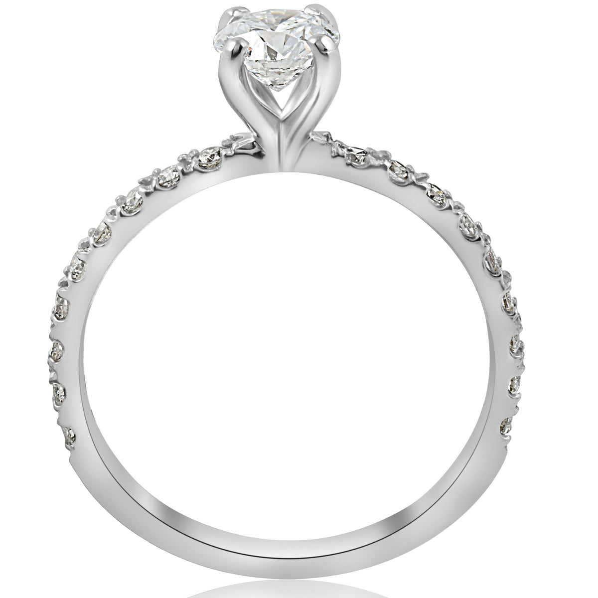 This 3/4ct Diamond Engagement Ring French Pave Set by Pompeii3 features a 1/2ct round brilliant cut diamond surrounded by 18 round brilliant cut diamonds, all French pave set in solid 14K white gold. The sleek, polished setting makes this ring an enduring symbol of love and commitment, perfect for those who appreciate refined elegance.