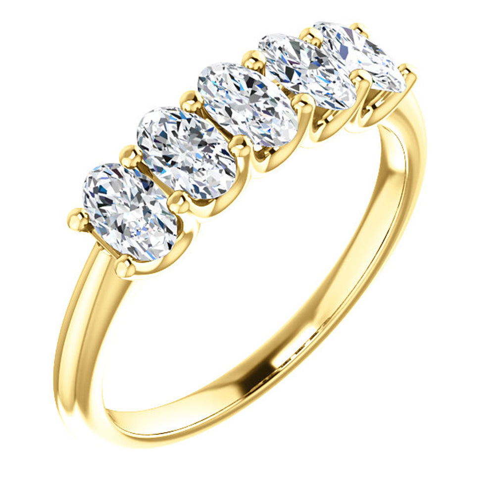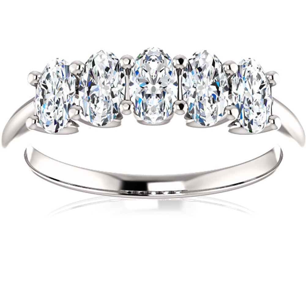 Handcrafted in white, yellow, or rose gold with five 5x3mm oval moissanite stones.