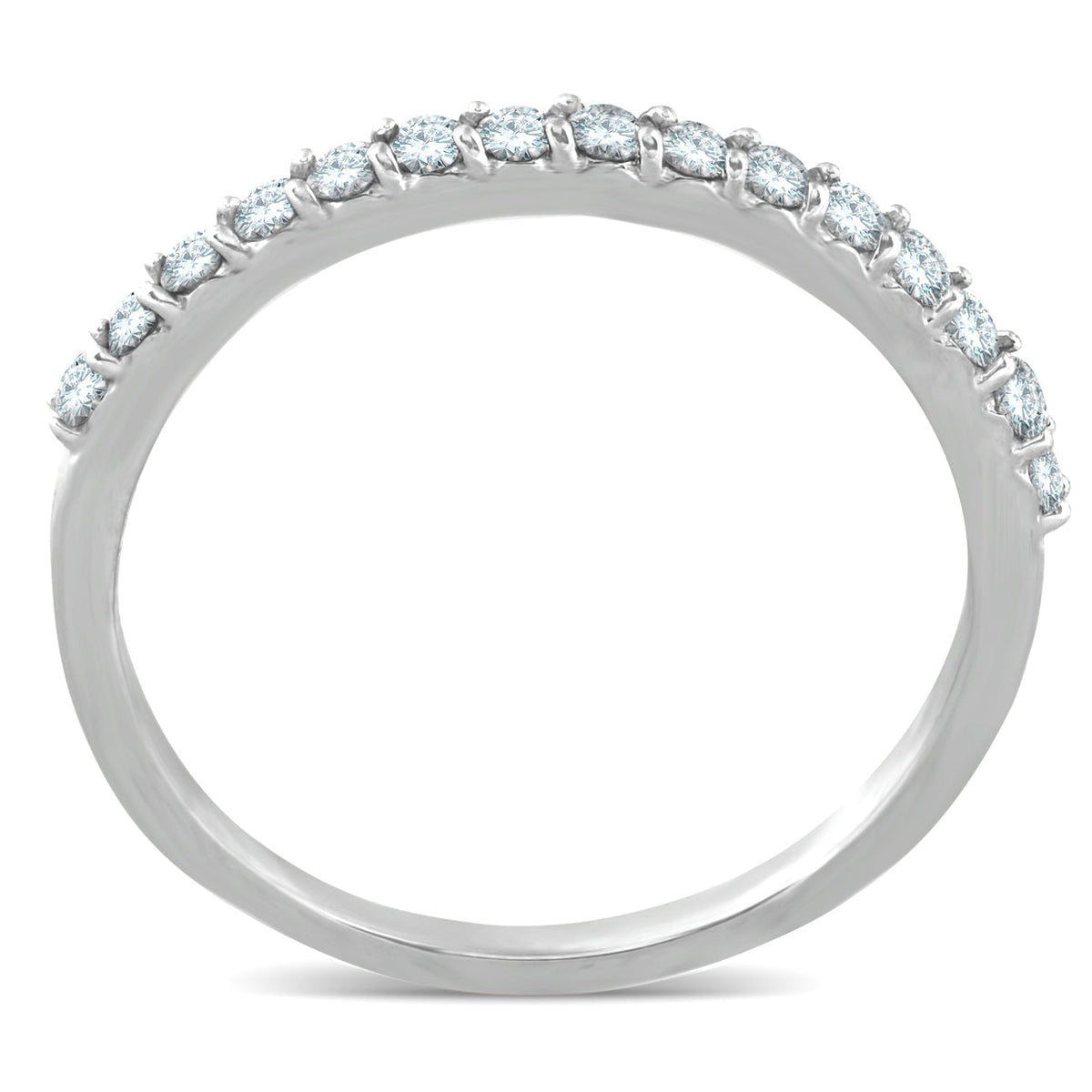This 1/2ct Diamond Wedding Ring Stackable Women's Anniversary Band by Pompeii3 features round brilliant cut diamonds prong set in solid 10K white gold. The diamonds go halfway around the ring, making it perfect for stacking or wearing alone. Its classic design ensures that it will complement any engagement ring, symbolizing enduring love and commitment.
