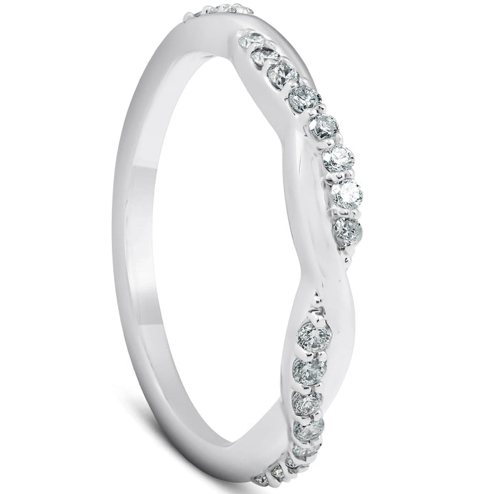 This 1/5Ct Diamond Infinity Wedding Ring Women's 14K White Gold Interwoven Stack Band by Pompeii3 features 19 round cut natural diamonds set in solid 14K white gold. The interwoven design creates a flowing, infinity-inspired pattern, making this ring ideal for stacking or wearing alone to represent eternal love and commitment.