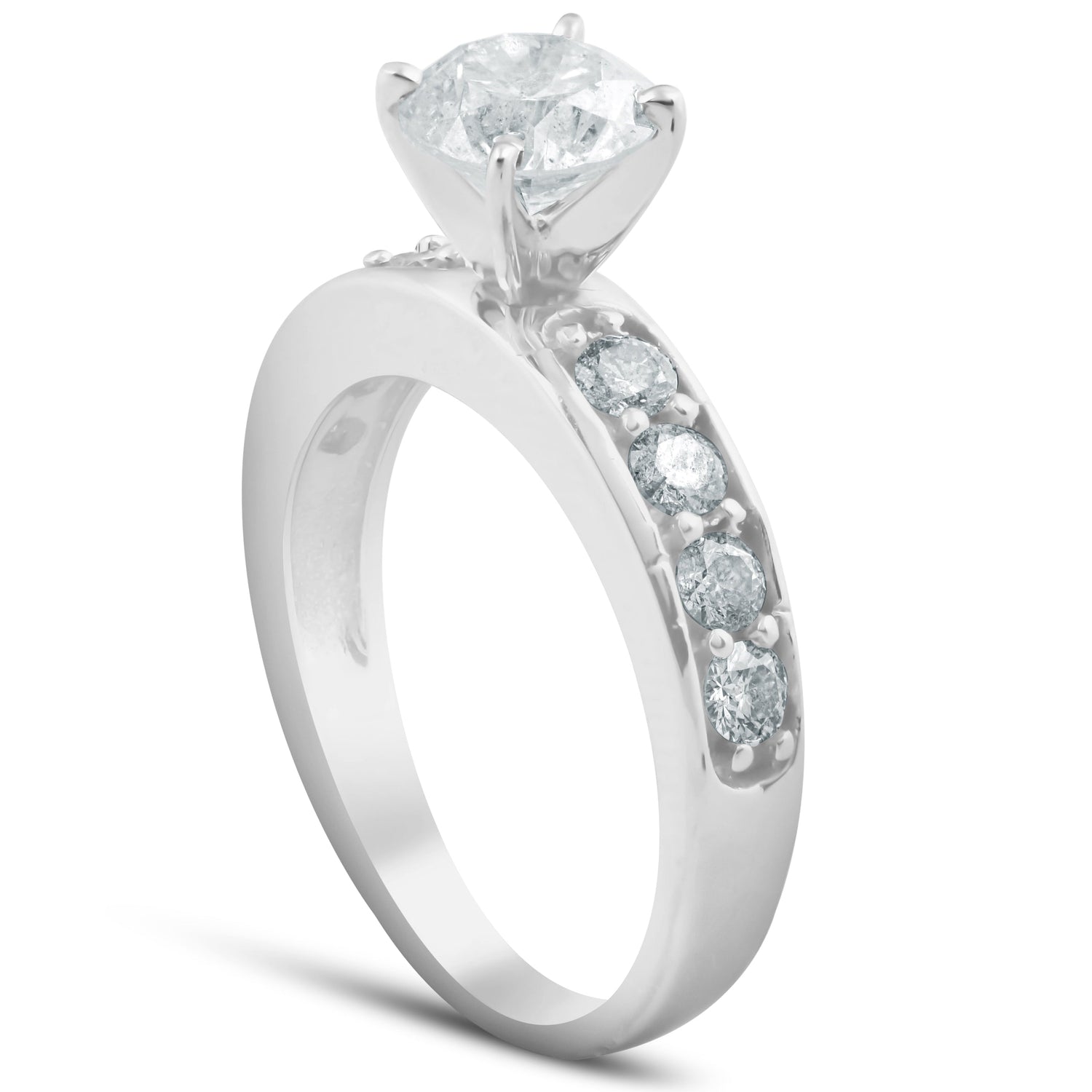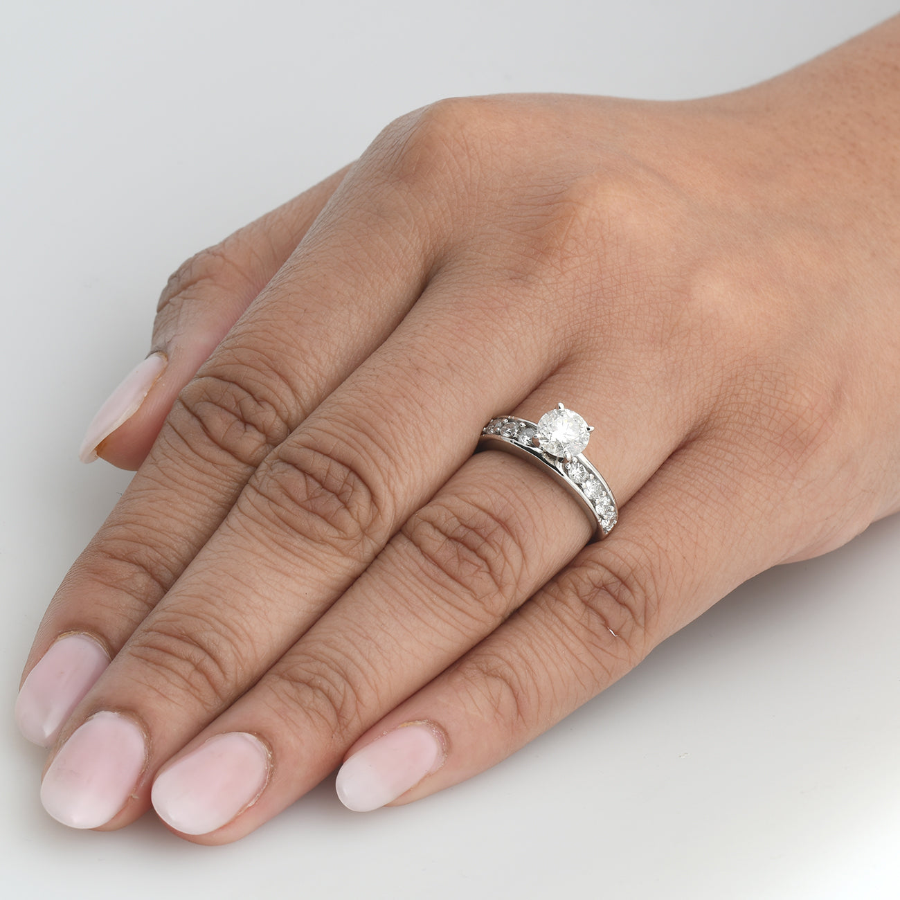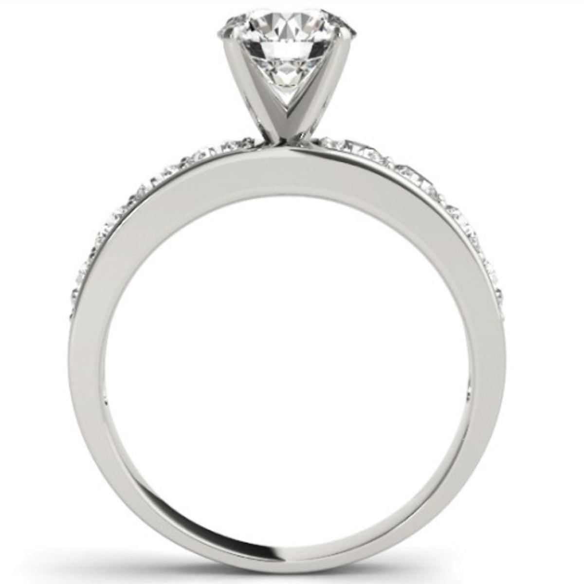 This 2 Ct Round Cut Diamond Engagement Solitaire Ring 14K White Gold by Pompeii3 features a 1 1/10ct round cut center diamond, complemented by 8 round cut accent diamonds. Set in a durable 14K white gold channel setting, this ring is both classic and modern, offering timeless elegance for the bride who loves simple sophistication.