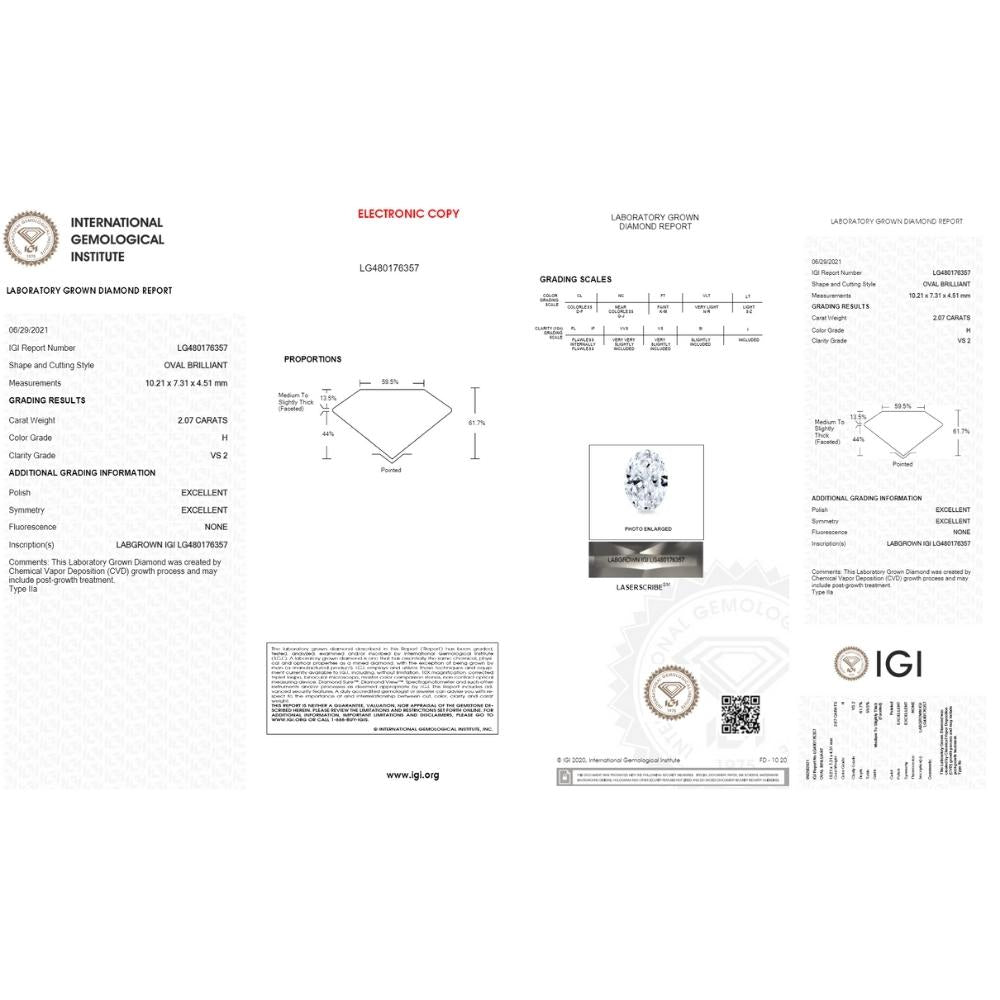 Handcrafted in 14K white gold with a 2ct GH color VS2 oval lab-grown diamond and 26 round-cut natural diamonds. Diamonds are of VS clarity and G-H color.