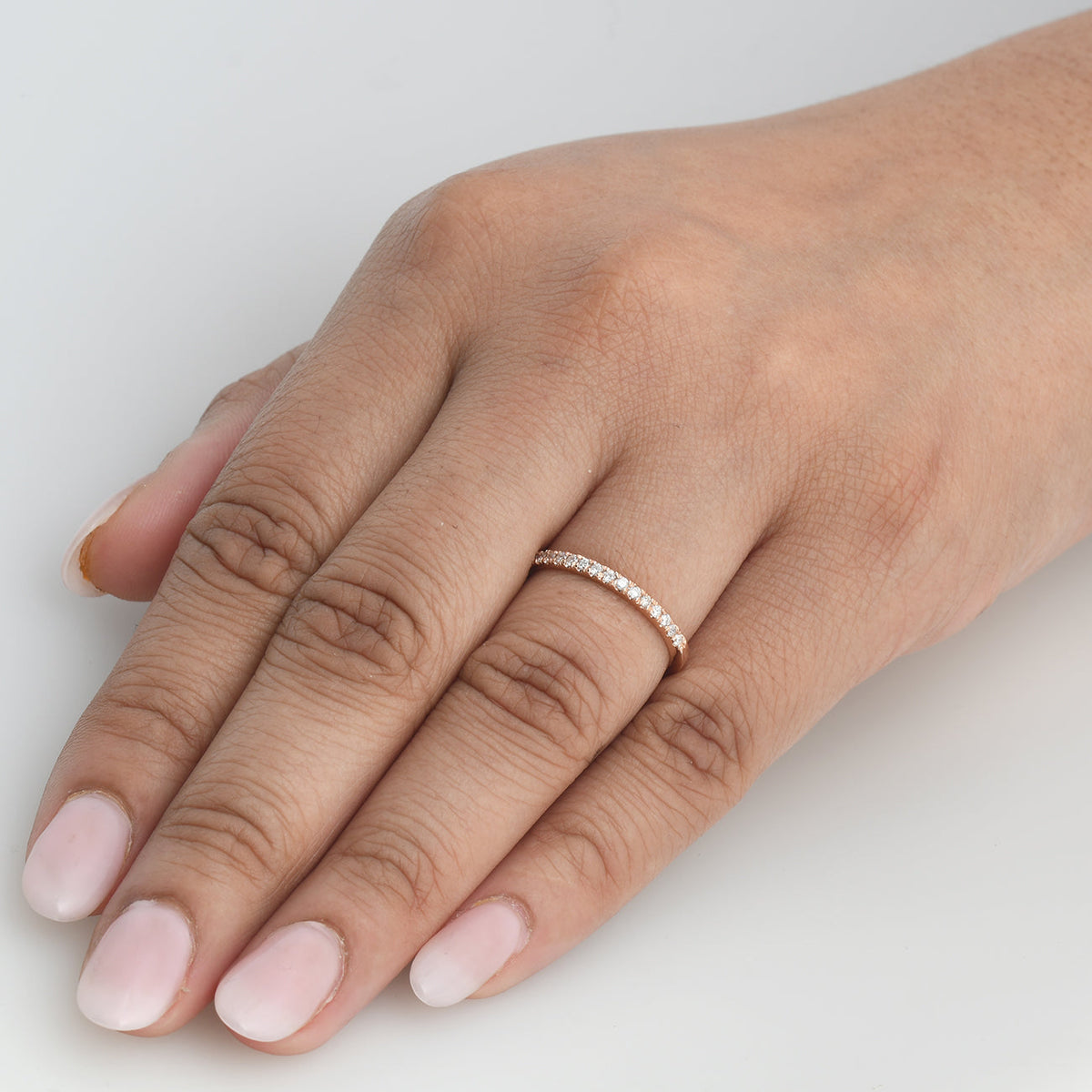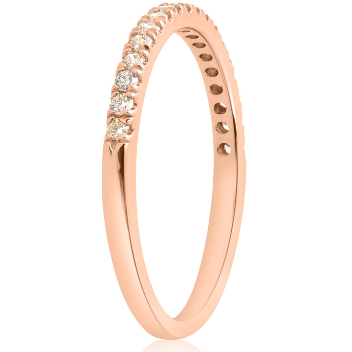 This 1/4 Ct Diamond Wedding Ring 10K Rose Gold by Pompeii3 features round-cut diamonds, set in solid 10K rose gold. The perfect addition to any engagement ring, this delicate and elegant band is ideal for stacking or wearing alone.
