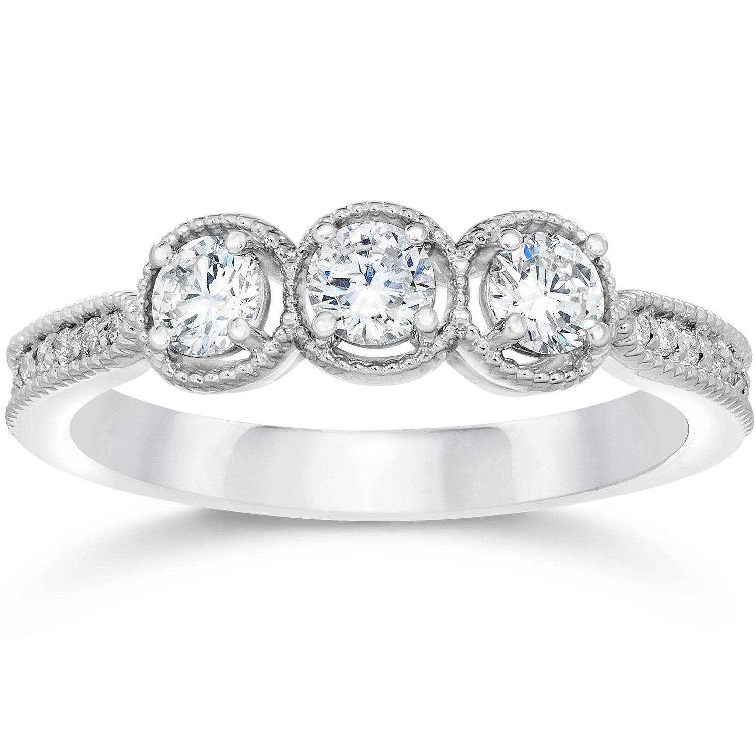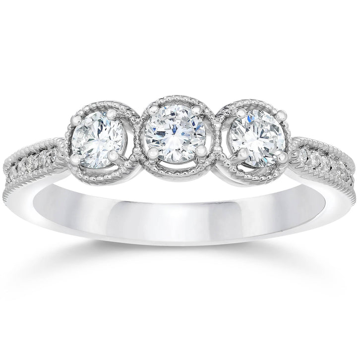 This 1/2 Carat Vintage 3-Stone Diamond Ring 10K White Gold by Pompeii3 features 17 round cut diamonds, set in solid 10K white gold. A timeless design, this vintage-inspired ring is perfect for those who appreciate classic elegance with a modern twist.