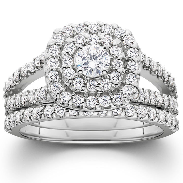 This 1 1/10 Ct Diamond Cushion Halo Engagement Wedding Ring Set by Pompeii3 is designed for those who cherish classic elegance. The engagement ring features a dazzling round cut natural diamond, surrounded by a cushion halo of brilliant diamonds for an enchanting sparkle. The matching wedding band complements the design, making it a perfect bridal set that symbolizes eternal love. Crafted in solid platinum, this ring set is a luxurious and enduring choice.