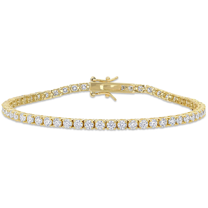 Yellow gold-plated sterling silver setting. 56 round-cut prong-set created white moissanite gemstones. Secured with a box clasp. Total gemstone weight: 5.10 DEW ctw. High-polish finish.