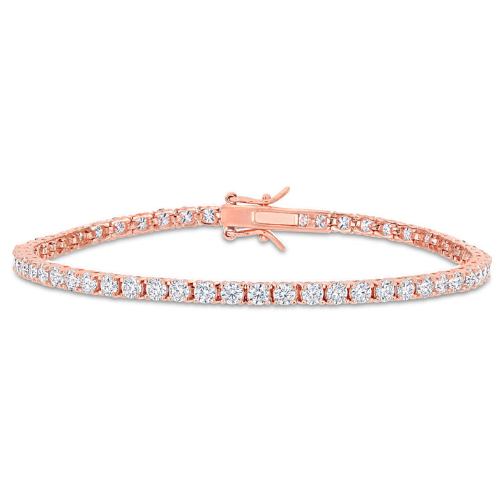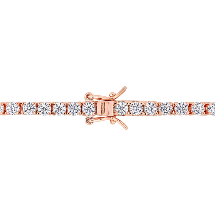 Rose gold-plated sterling silver setting. 56 round-cut prong-set created white moissanite gemstones. Secured with a box clasp. Total gemstone weight: 5.10 DEW ctw. High-polish finish.
