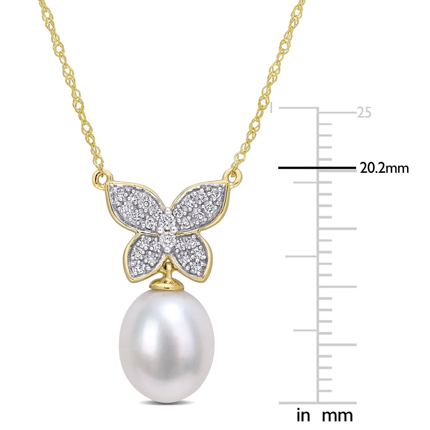 9-10 MM Freshwater Cultured Pearl and 1/8 CT TDW Diamond Butterfly Drop Pendant with Chain in 10k Yellow Gold