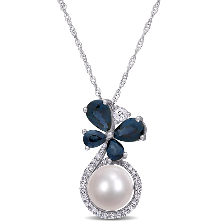 7.5-8 MM Cultured Freshwater Pearl and Sapphire White Sapphire and 1/8 CT TW Diamond Butterfly Drop Necklace in 10k White Gold