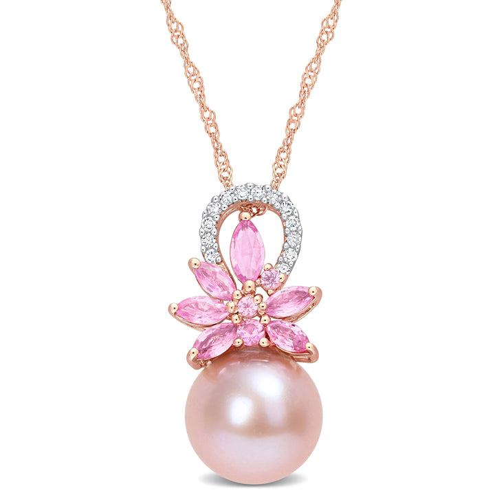 9.5-10 MM Cultured Freshwater Pearl and 1/2 CT TGW Pink Sapphire andnd Diamond Accent Flower Pendant with Chain in 14k Rose Gold