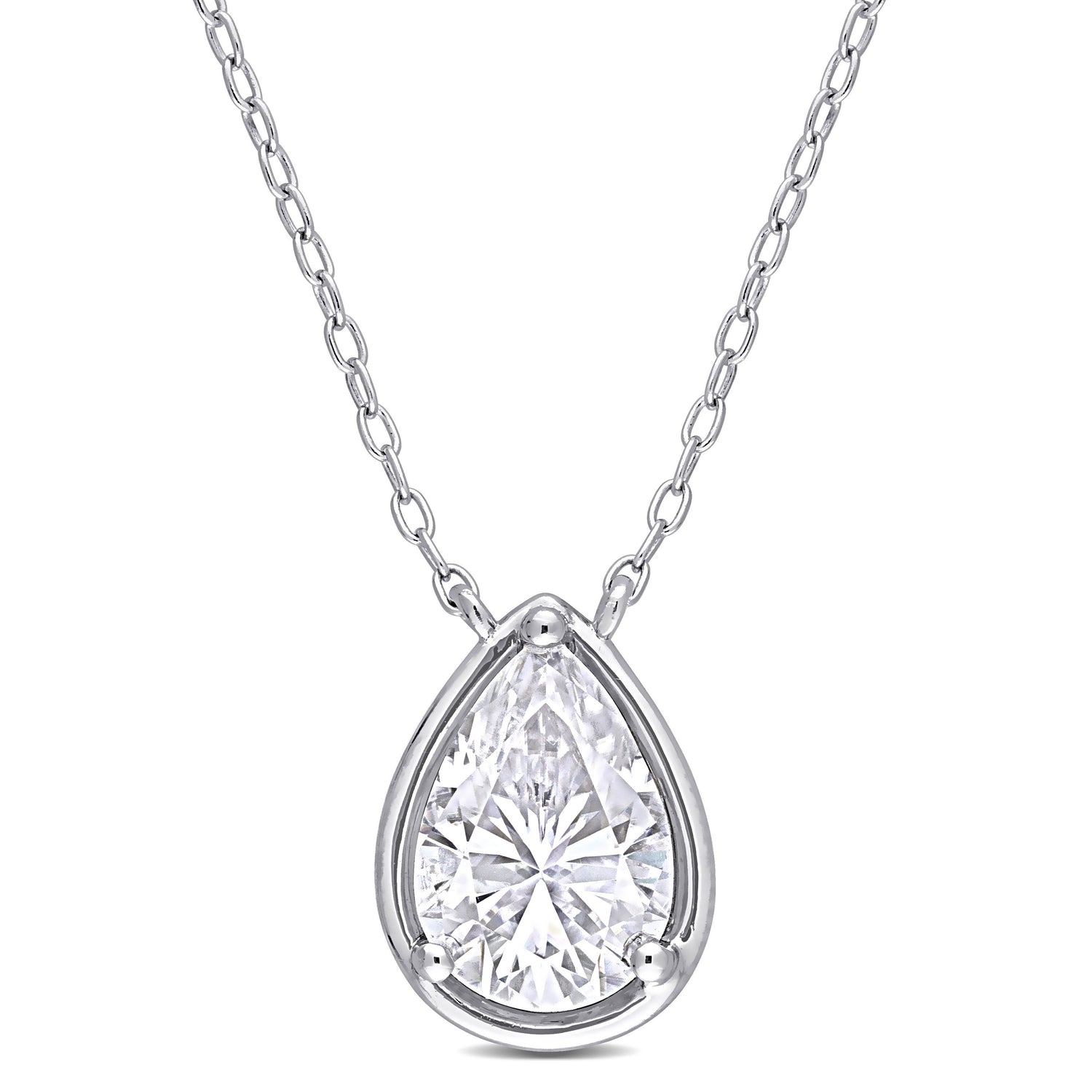 Solid sterling silver setting. Center stone: 2 ct pear-cut bezel-set created white moissanite (10x7 mm). Chain: 18-inch round cable chain. Secured with a spring ring clasp. High-polish finish.