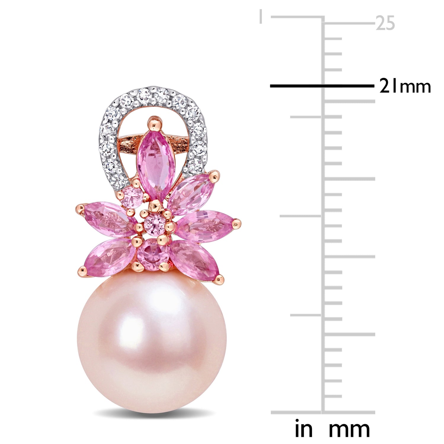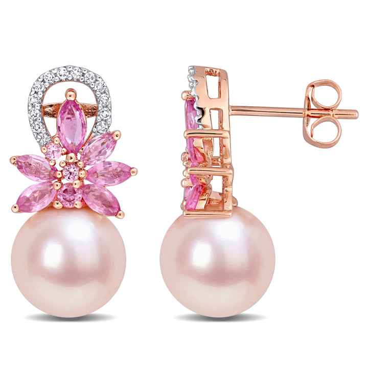9-9.5 MM Pink Cultured Freshwater Pearl and Pink Sapphire and 1/8 CT TW Diamond Flower Drop Earrings in 14k Rose Gold