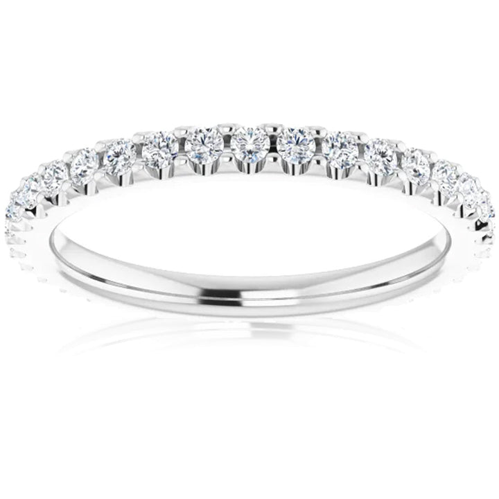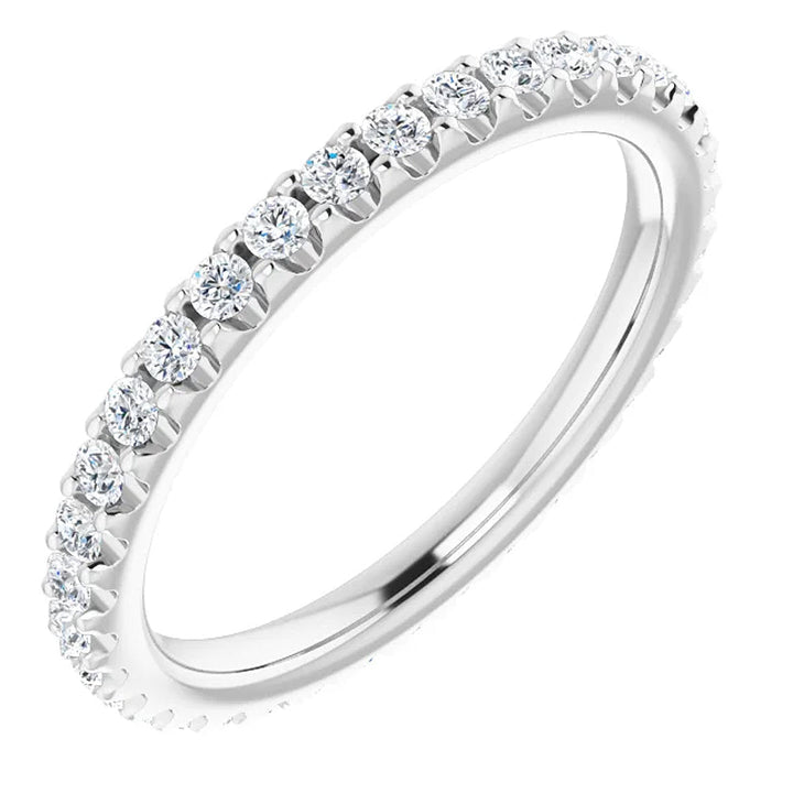 This 1/2 Ct Lab Grown Diamond Eternity Ring by Pompeii3 is a delicate yet radiant band designed for stacking or wearing alone. Featuring round-cut lab-grown diamonds prong-set in a sleek 14k white gold band, this ring is a versatile and timeless addition to any collection.