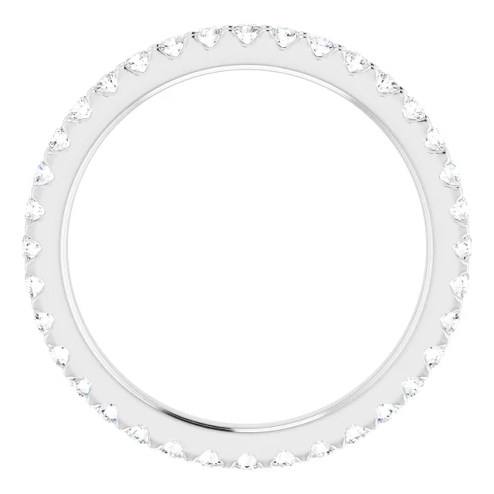 Solid 14k white gold setting. Round-cut lab-grown diamonds. Prong setting. Diamond clarity: SI. Eternity band design. High-polish finish.